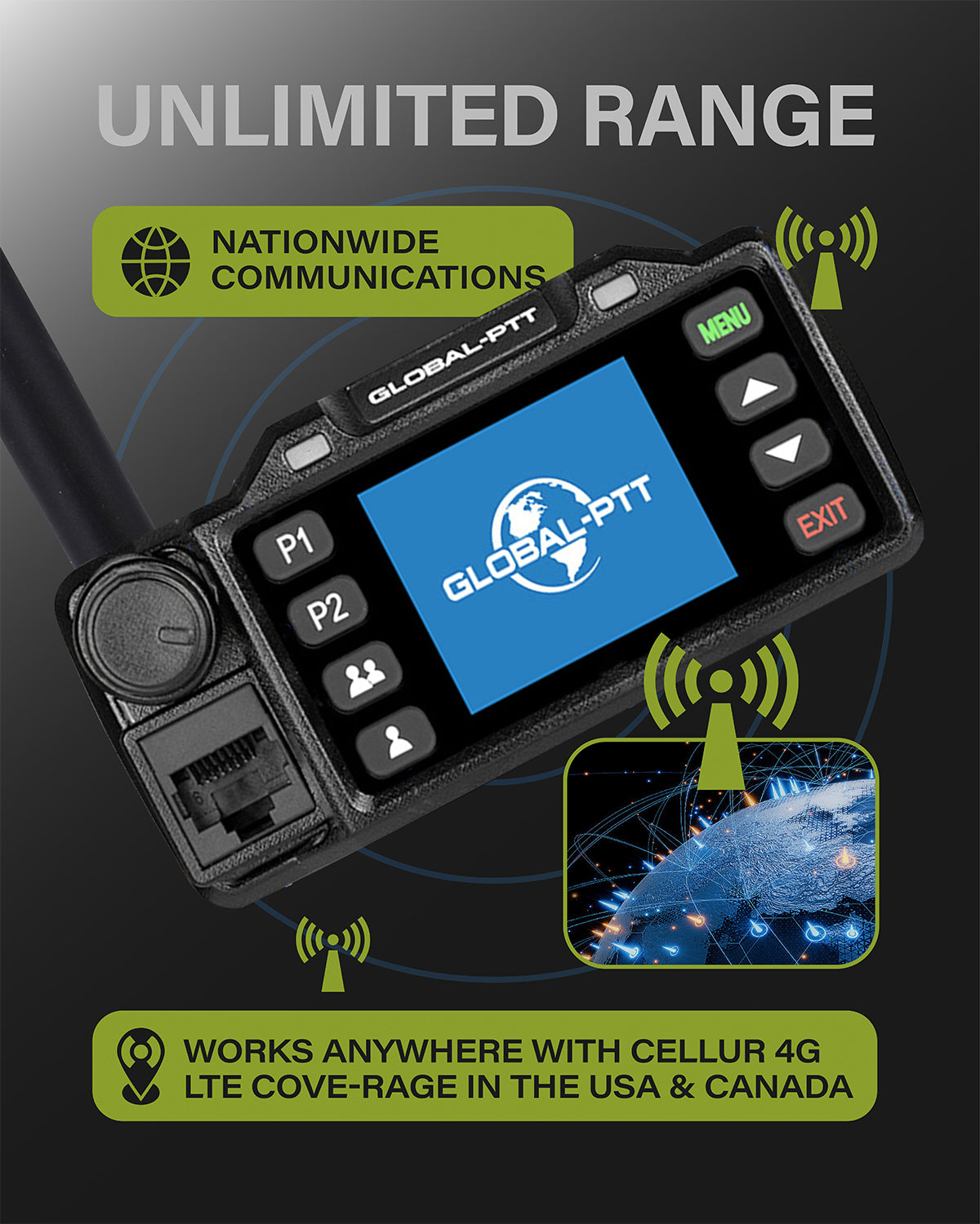 Global-PTT 2-Pack Push-to-Talk Over Cellular (PoC) Mobile Radios Walkie Talkies - 4G LTE Nationwide PTT Unlimited Range Free License for in-Vehicle Communication